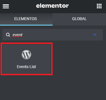Para exibir uma listagem ou cards em uma página Elementor deve-se adicionar o widget Events List na página desejada: