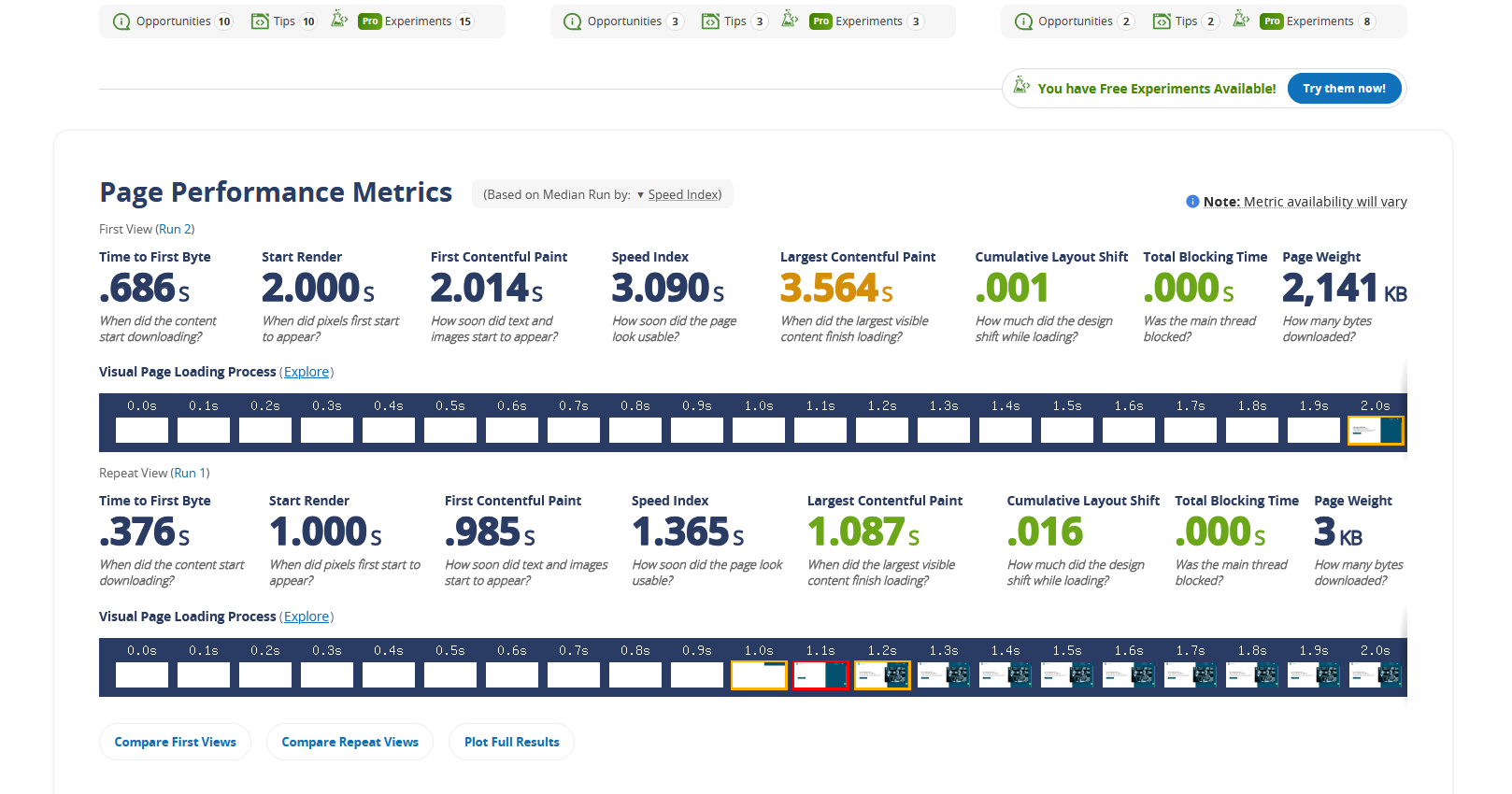 Como pode se ver, ao marcar a opção de First view and Repeat view o site volta a repetir a requisição agora com cache funcional o que fica descrito no segundo resultado. No exemplo percebe-se que o site se encaixa numa ótima métrica de desempenho, com o cache ativo, sem ele fica entre ótimo e aceitável.