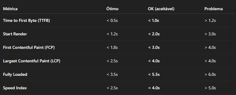 Baseado nos resultados há uma tabela que pode ser seguida para métricas padronizadas de sites com desempenho aceitável.