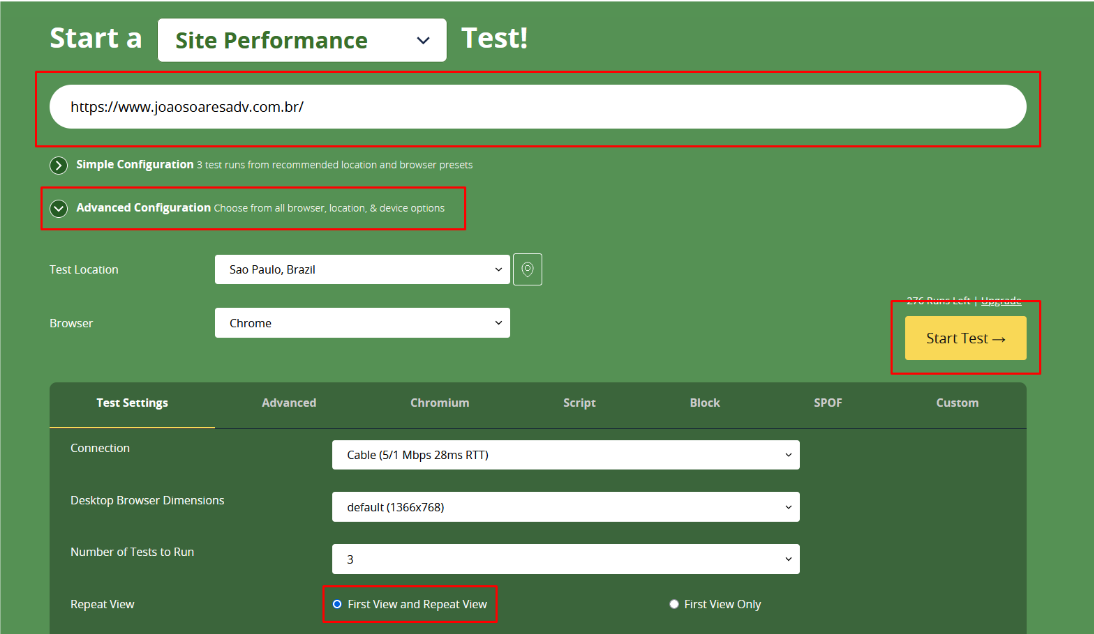 Depois de efetuar o registro e login, é só pegar a URL do site a ser analisado e colar no campo, ir em opções avançadas e selecionar First view and Repeat view para que o cache seja levado com consideração e por fim Start Test.